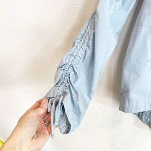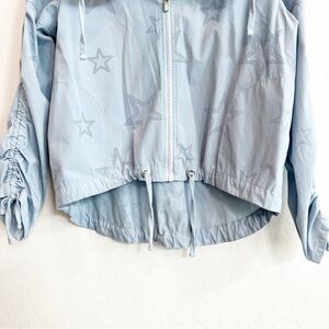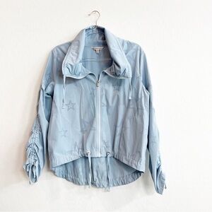 Nanette Lepore 'Glacier Estrella' star cutout nylon high/low jacket. Cinches at the bottom and wrists, pretty blue color. Excellent pre-owned condition.