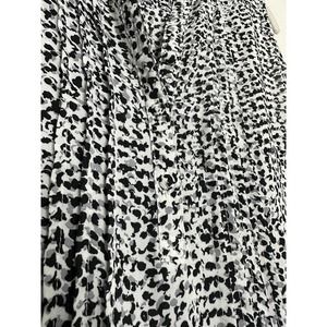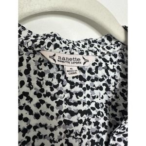 This beautiful Nanette Lepore dress features a trendy animal print pattern, sleeveless design, and a flattering fit and flare silhouette. The Henley neckline adds a touch of sophistication while the pleated, ruffle, and layered accents create a playful and feminine look. The dress is made of lightweight chiffon material and has a comfortable zipper closure. It is perfect for various occasions, including travel, casual outings, workwear, and business events. The dress is a size 6 and has a collarless design, making it suitable for summer, fall, and spring seasons.