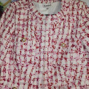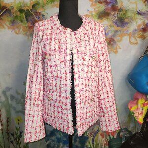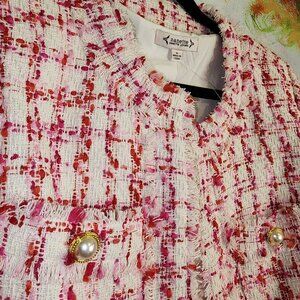 This Nanette Lepore tweed jacket, with its exquisite pearl button accents and playful fringe details, is a statement piece for any wardrobe. Its vibrant red and white hues add a touch of elegance and charm, making it a standout choice for those who appreciate timeless fashion.