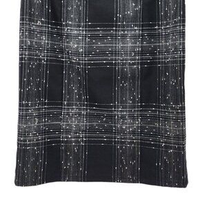 High waisted knee length pencil skirt - black with a white abstract plaid pattern. Hints of black satin fabric around the waist. Slit on back. Inner black lining. 49% Rayon, 41% Wool, 8% Nylon & 2% Elastane. Lining is 100% Acetate. Made in USA. Office, work, business, career attire, going out, party, cocktail