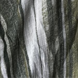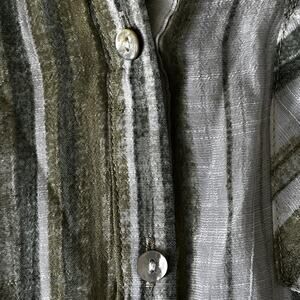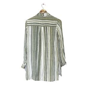 Lightweight semi sheer fabric. Cream with Prairie Sage Green vertical stripes. Pullover style with half button front. Collared. Small pocket upper left. Long sleeve with button cuff. High Low hem.