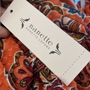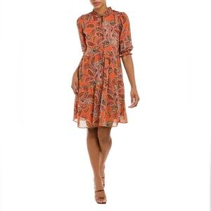 New with tags Nanette Lepore dusky orange paisley dress. 3/4 sleeves. Ruffle detailing. Tie at neckline. Lined. Stunning on. Dress up or down! Perfect year round.