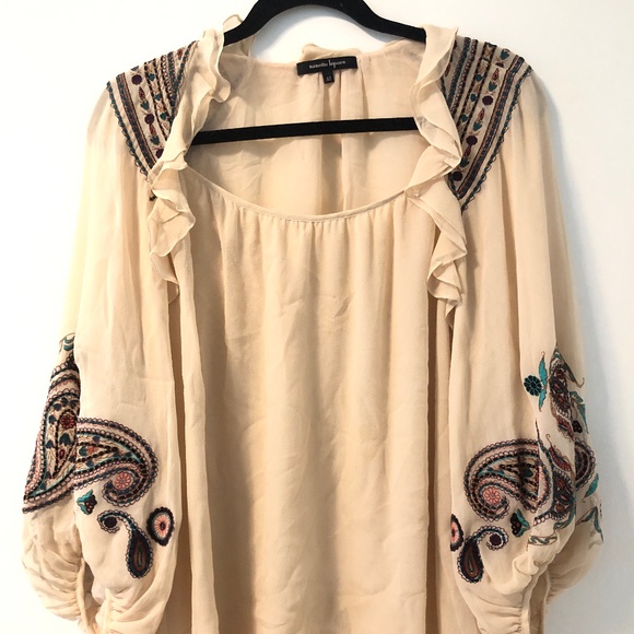 If you love, Johnny was Free People and Anthropologie you’ll really like this Nanette Lepore he blouse. Pretty embroidered detail. Looks great in a French tuck. Or with a belt. 100% silk size 12.
