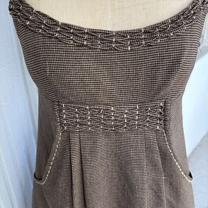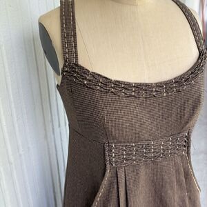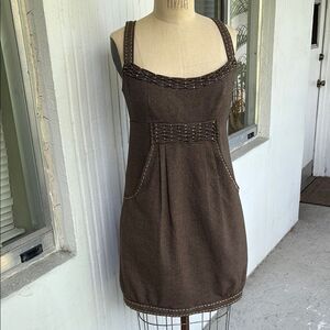 Check out the pictures. This is a super cute jumper dress with two pockets has a couple of pulled threads which I show in pictures. Measuring across the top of the dress pit to pit is 17 inches, strap drop measuring folded only to the front is 6 inches, through the umpire waist area is 15.75 from the center of the dress down to the hem is 26.