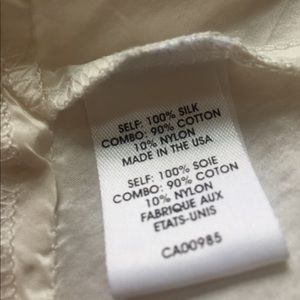 Bust 16" hips 19" length 23". Luminous & feminine ivory silk V-neck tank with see-through polkadot white straps and back. Normal wear no major issues. Very very light discoloration inside & under armpits . Hard to see if you aren't looking for it. I only saw it in flash photography