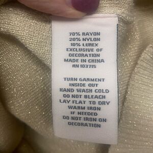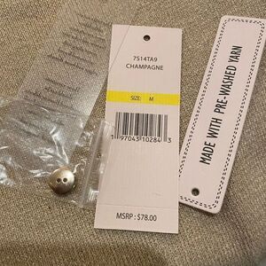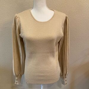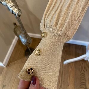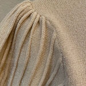 This gorgeous, pullover sweater has Ribbed sleeves with gold buttons on the cuff. Worn only one time. Check out the video to see the beautiful understated sparkle in the sweater. New condition. Beautiful champagne color.