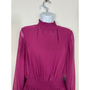 Gorgeous and feminine Nanette Nanette Lepore dress in Raspberry Radiance. Features long sheer sleeves, dotted chiffon overlay, ruffled tiered skirt, and smocked neck and waistline. Fully lined except sleeves. Includes shoulder pads for structure. New with tag, but there is a flaw on one side seam and a small seam tear in the back (see last photo).