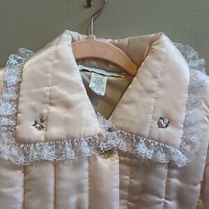 Nanette Undies Co Quilted Bed Jacket Blush Pink. Made in the USA. Brand tag is gone, but fabric tag is still attached. 2 button front closure. Sweet lace detail. Size Medium. Measurements are approximate and taken laying flat: