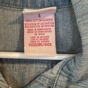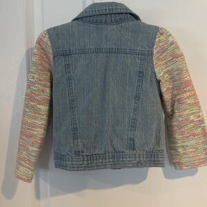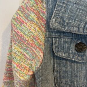 Adorable, gently preowned little girls, jean jacket. The main part of the jacket is denim, and the sleeves are soft sleeves are multicolored denim is a light washed blue it buttons up the front and has hearts and rainbow patches.