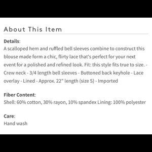 Adorable and feminine top, this has allover lace in the shade Cannoli Cream, with a lined body and flutter sleeves. Button closure at back neck.