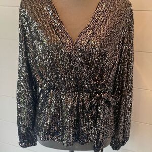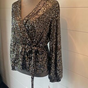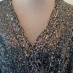 Metallic Surplice Sequin Top is a statement piece characterized by a faux wrap-style design with a V-neckline and metallic sequins.