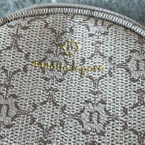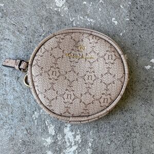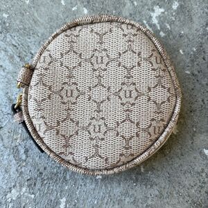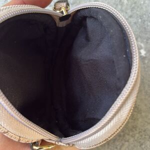 This is a sweet little round bag, but please look at the pictures it no longer has the wristlet strap. Measuring through the center is 4.25” x 1”.