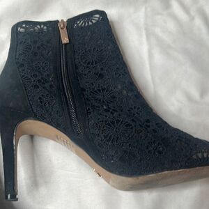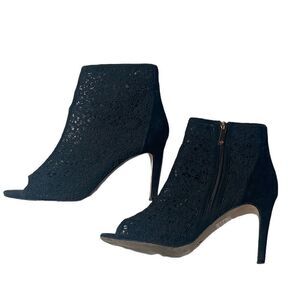 Nanette Lepore Lace Heidi Black Peep Toe Heel. Size 9. Mesh upper with lace overlay and suede heel. Inside zipper closure. Peep toe. Man-made lining and insole.