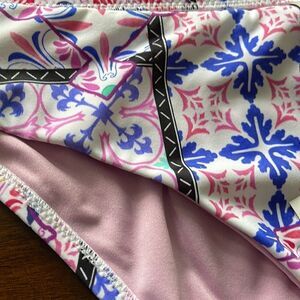 These Nanette Lepore swim bottoms are so pretty. They are a boho chic print with beautiful hues of blue, pink and yellow. The hips of these bottoms have a cute stitched detail to them. From hip to hip is 18”. From top to crotch is 9.5”.