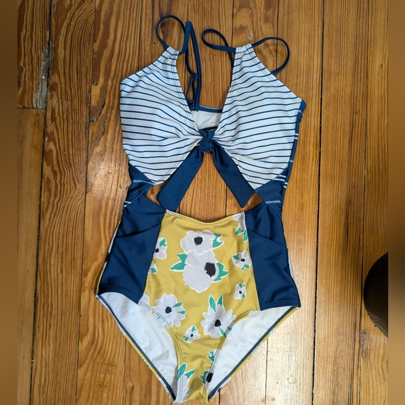 Stylish one-piece swimsuit with blue and white stripes on top and a yellow floral pattern on the bottom. Features a unique cut-out design. There are removable cups as well.