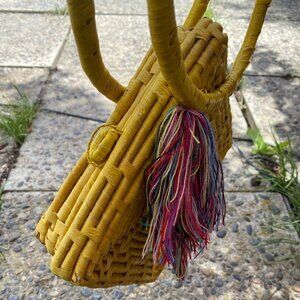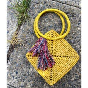 Nannacay yellow wicker woven square / diamond shaped handbag purse with circle handle. Loop closure. Colorful tassel detail. Approximately 9 x 9in.