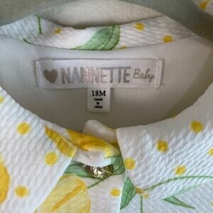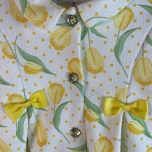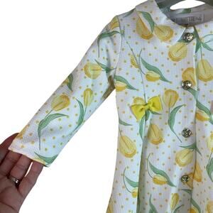 Nannette Baby Yellow Tulip Coat Jacket. Size 18 Months. Adorable tulip print coat or jacket in a polyester blend. 5 clear button front closure, long sleeves and yellow ribbon bow accents at waist. Lined. This came with a sleeveless dress but only the coat jacket being sold here. Lined. In like new condition.