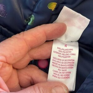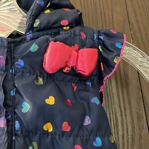 Nannette kids sleeveless quilted, puffer hooded navy blue vest. The vest has shiny hearts of various colors. Capped sleeve with pink and a pink flower. Hood has a pink bow and ears. Size 4.