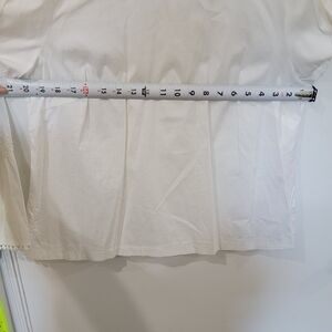 White Peasant blouse with bell sleeves. Two stripes of lace on sleeves with ticking on the hems. Keyhole and button back closure.