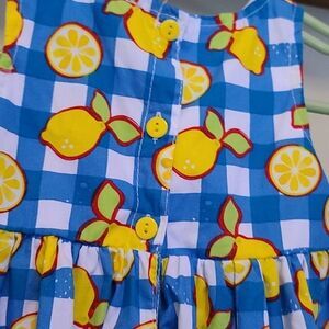 Beautiful baby's dress with bloomers outfit featuring whole lemons with green leaves, half lemons outlined in red, little lemon spirits all across on top of a white blue plaid design with double yellow white polkadot trim along waist with double bows and along bottom. Has a button up enclosure with yellow buttons in back and a round neckline. Size 6-9 months, no damages from nannette baby.
