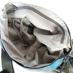 o The exterior is sturdy, slouchy yet light weight canvas in beige, gray & blue. Has a coated canvas side panel, coated florals with Italy's famous comic character Palmiro Duck.