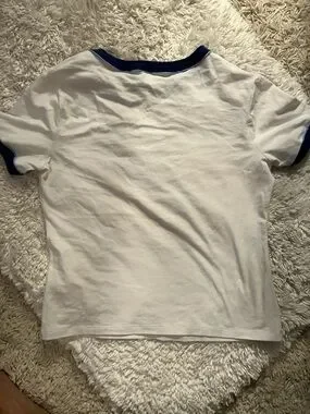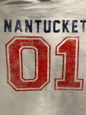 Classic white ringer tee with navy trim and bold red '01' print. Features 'Nantucket' text for a preppy, sporty look. Soft cotton construction for everyday comfort. Easy to pair with shorts or jeans. Never worn❤️☀️