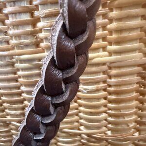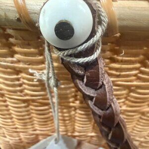 Woven wicker and splint basket, wood base and top rim, braided leather handles, 4 ivory toned buttons and brass nails