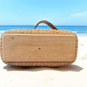 A Nantucket state of mind. This handwoven Nantucket basket is the real deal. Tightly woven wicker and splint has a wood base and curved wood top rim. A pair of braided leather handles are attached to the framework by 4 ivory colored "buttons" and tiny brass nails. What a perfect tote for the summer!