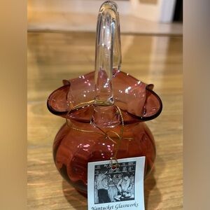 Beautiful vintage Nantucket Glassworks cranberry glass basket with a delicate ruffled edge and clear glass handle. Handcrafted with stunning cranberry pink hues, this elegant piece is perfect for display, gifting, or adding to your glass art collection. A timeless collectible that brings charm and sophistication to any home décor.