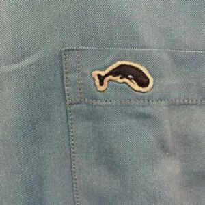 This classic blue button-up shirt from Nantucket Whaler is a must-have addition to any wardrobe. With its solid pattern and long sleeves, this shirt is perfect for any occasion, whether it's a day at the office or a casual weekend outing. The collared neckline and button closure add a touch of sophistication, while the button and logo accents give it a unique flair.