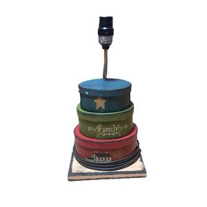 Loved this lamp. Changing decor. Wooden lamp with 3 primitive attached stacking boxes. 14” high x 7 1/2” wide. No shade.