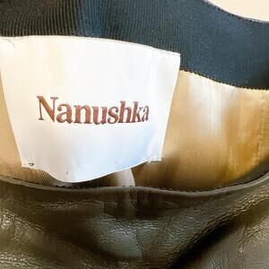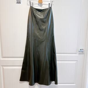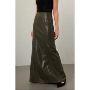 Elevate your wardrobe with this stunning Nanushka faux leather midi skirt in a deep olive green. Crafted with a high-quality vegan leather finish, this skirt offers an A-line silhouette that flatters the figure while remaining structured and modern.
