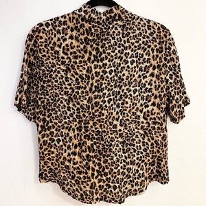 Condition is pre owned. No holes or stains. This leopard print fitted shirt has short sleeves and can be closed with buttons on the front. This is a classic collar cut with fluidity. Wood buttons.