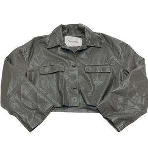Green faux leather (56% Recycled Polyester, 44% Polyurethane). Jacket. Long sleeves. Collar. Front button closure. 21" from shoulder to hemline. Imported.