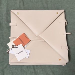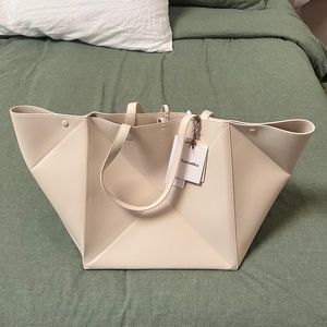 Description from website: Channelling Nanushka's craftsmanship and thoughtful designs, this cream-hued iteration of the Origami tote is defined by its collapsible silhouette inspired by the Japanese paper folding technique.