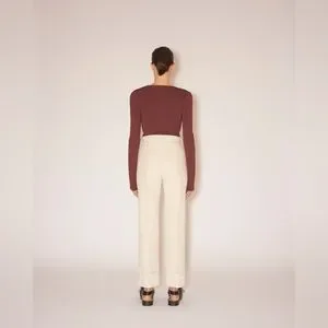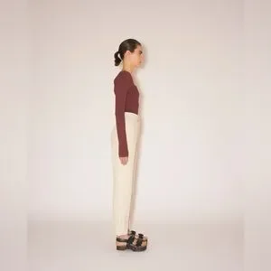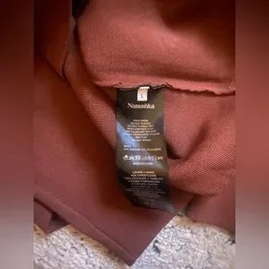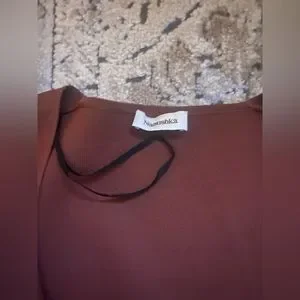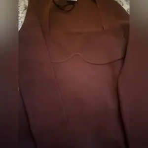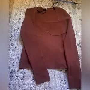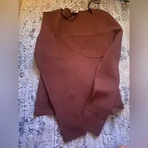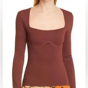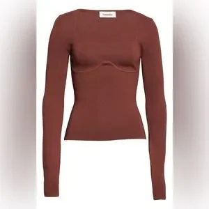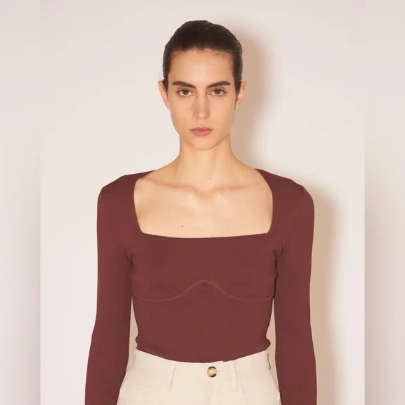 Nanushka Mio Mahogany Brown Long Sleeve Corset Knit Square Neck Sweater in size large is a shapely sweater in a neutral mahogany hue, perfect for effortless layering or a sultry solo act. It features long sleeves and a corset design with ribbed under-bust detail, crafted from 54% viscose and 46% polyamide.