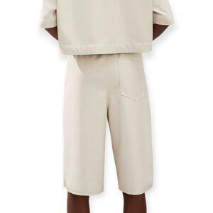 Crafted from Nanushka’s signature soft vegan leather, the Yolie Shorts embody the brand’s effortless blend of luxury and sustainability. These high-waisted Bermuda shorts feature a relaxed silhouette with side slit pockets, a thick elastic waistband, and a single back patch pocket for a clean, tailored finish. The subtle sheen of the off-white hue enhances the modern minimalism that defines Nanushka’s aesthetic.