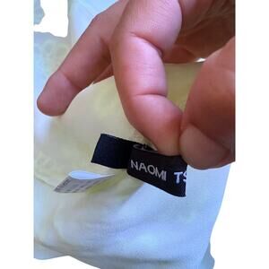 Naomi Tsukishima mini skirt with a sheer white overlay extending past a lined mini length, waist 30″, length 18.25″. The sheer layer is subtly longer than the lining, giving a peek-a-boo effect that’s both soft and statement-making. Crafted with light, airy fabric (likely silk blend or fine polyester), in excellent condition.