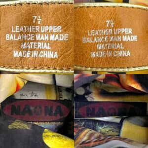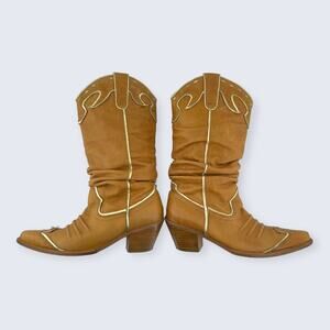 Naona (not sure if the star in the middle of the logo is an "o") cowgirl western boots with a 2.5" stacked heel and are in a light brown (darker than tan), 1/4" sole. I believe these are 90's vintage? Size 7.5. Good used condition, the points of the toes are worn.