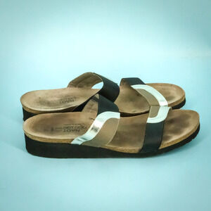 Naot 42 Size 11-11.5 Frankie Black Tan Silver Metallic Leather Slip On Sandals