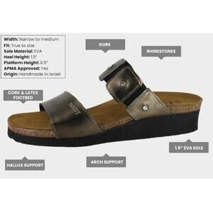 The Naot Ashley is a feminine slide sandal with rhinestone accents across the instep and gore for adjustability. Naot's anatomic cork and latex footbed is wrapped in a pampering suede and molds to the shape of the foot with wear. American Podiatric Medical Association (APMA) Accepted for promoting good foot health.
