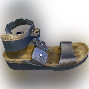 The Naot Ashley is a feminine slide sandal with rhinestone accents across the instep and gore for adjustability. Naot's anatomic cork & latex footbed is wrapped in a pampering suede and molds to the shape of the foot with wear.