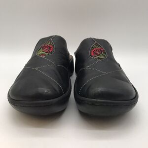 Naot Black Leather Clogs. Women's size 7 or EUR 38, Embroidered Red Floral and Stitching, Slip On Mules, Comfort Shoes.