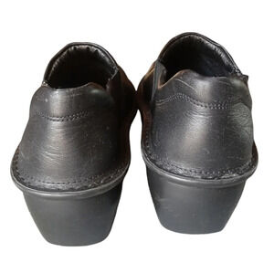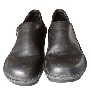 Sleek black leather mules. Comfortable wedge heel. Convenient side zipper.