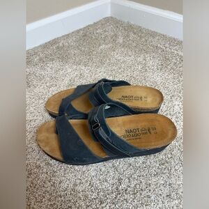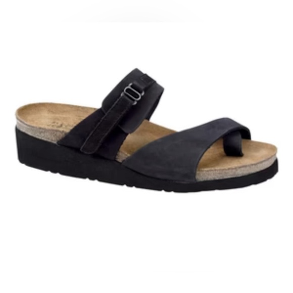 The Naot Jessica is a slide sandal with a hook & loop strap at the instep. This style has a toe loop which helps holds the foot in place when walking. Naot's anatomic cork & latex footbed is wrapped in a pampering suede and molds to the shape of the foot with wear.