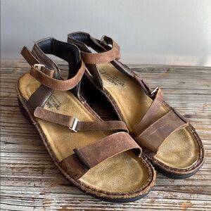 Stylish brown leather sandals with strappy design. Perfect for casual wear.