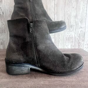 A great charcoal grey suede pair of boots. Double side zipper to throw these on quickly. Lightly worn and photos of all angles to review. Most noticeable wear is rub marks on the inside heels. Size 39 that is 8-8.5 women’s. These will hit above the ankle when wearing.