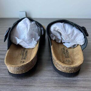 The Santa Cruz is a classic everyday slide. This shoe features two buckle closures for complete adjustability. Naot's anatomic cork and latex footbed is wrapped in a pampering suede and molds to the shape of the foot with wear.