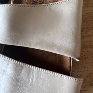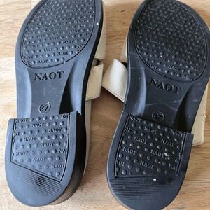 Elegant cream leather sandals by Naot. Features a comfortable footbed.