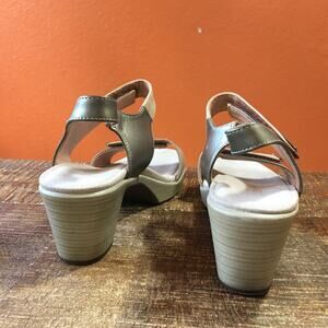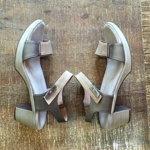 This is a pair of Naot Intact Sandals in color Khaki Beige Leather/Pewter Leather/Mirror Leather. Womens size EU 39, US 8. 2.25" Heel. 0.75" Platform. Hook and loop adjustable strap. Leather upper and lining. Microfiber-covered cork and natural latex footbed for all day comfort. Metal shank for lateral support. Anatomical contouring.